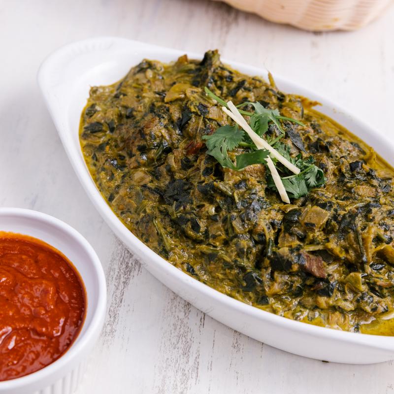 Chickpeas served in spiced spinach curry and fenugreek.