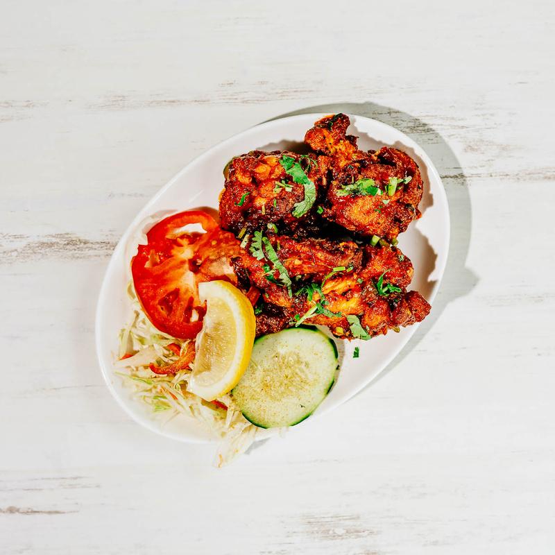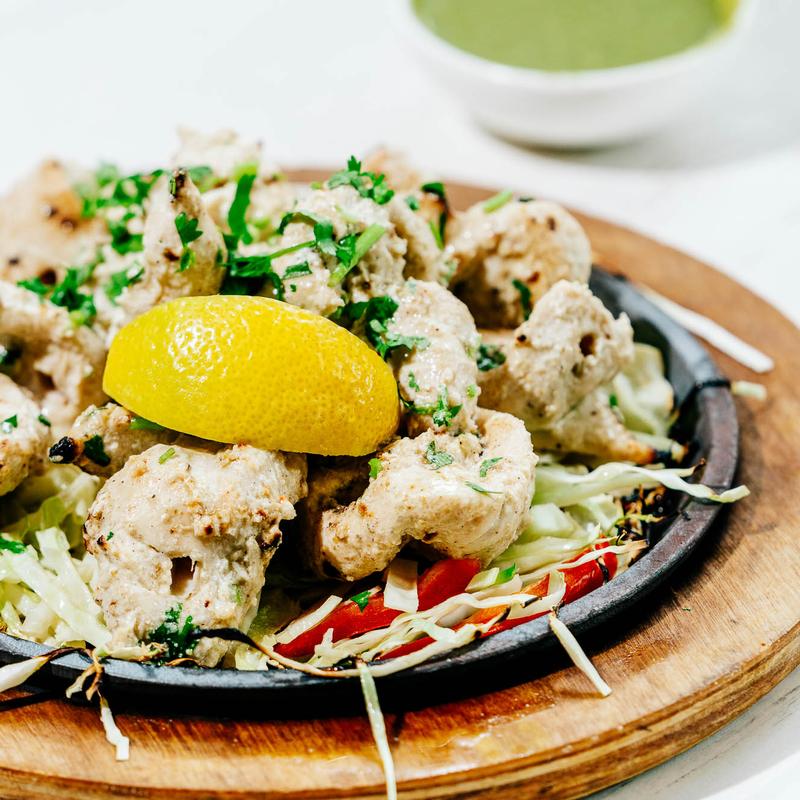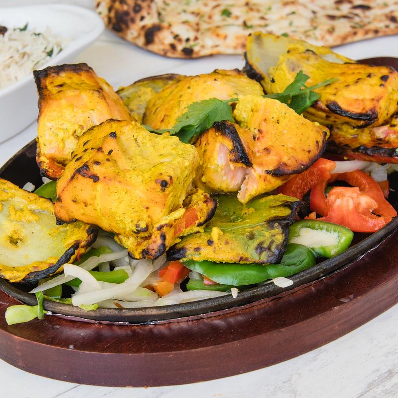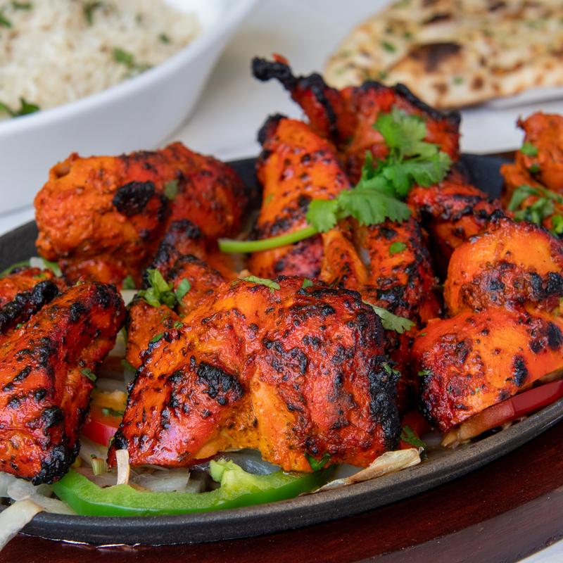 Chicken marinated in a mixture of yogurt, lemon juice, and traditional Indian spices, then cooked in a clay oven to achieve a smoky, charred flavor. This dish is a classic favorite, offering tender and juicy chicken with a deliciously spiced crust. (Contains Dairy) GF, NF.