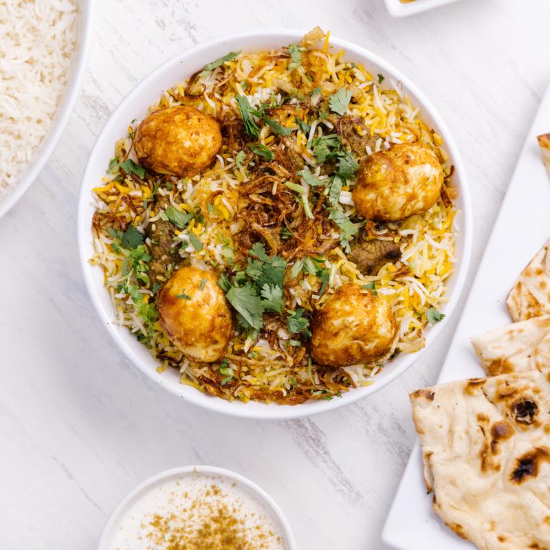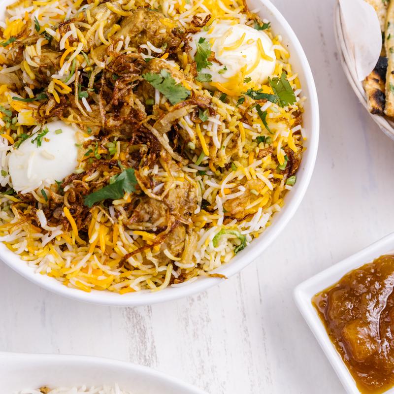 Chunks of boneless chicken cooked in fragrant basmati rice.
