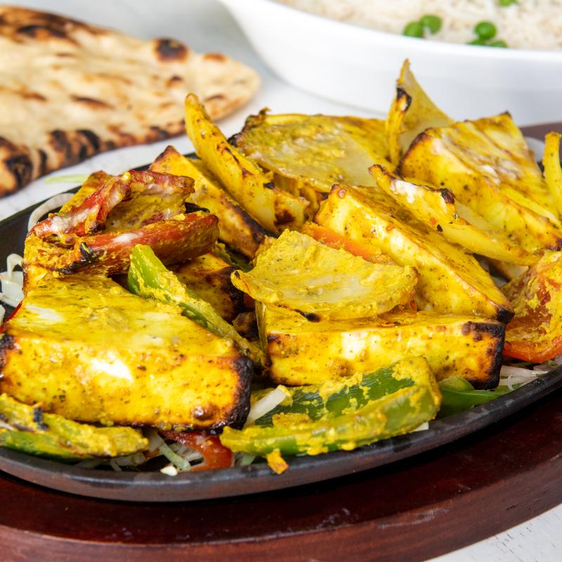 Indian cheese (paneer), bell peppers, and onions marinated in a fragrant blend of fenugreek, garam masala, and yogurt, then cooked in a clay oven to achieve a perfect char. This dish is a flavorful vegetarian favorite, offering a delightful mix of smoky and aromatic spices. GF, CV