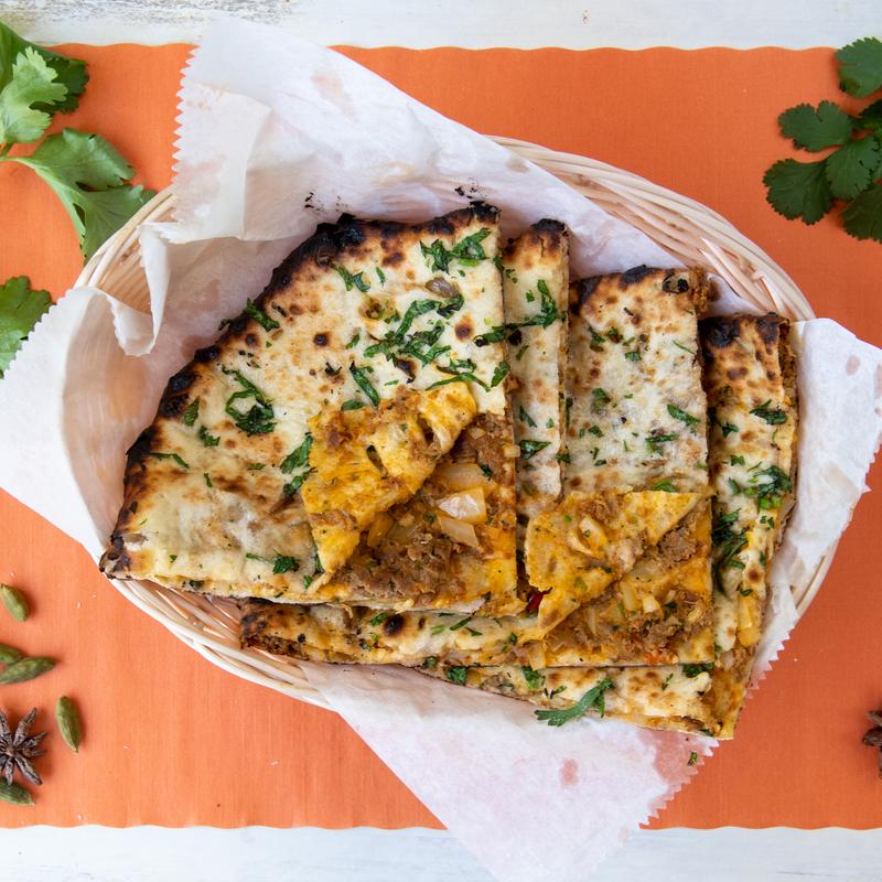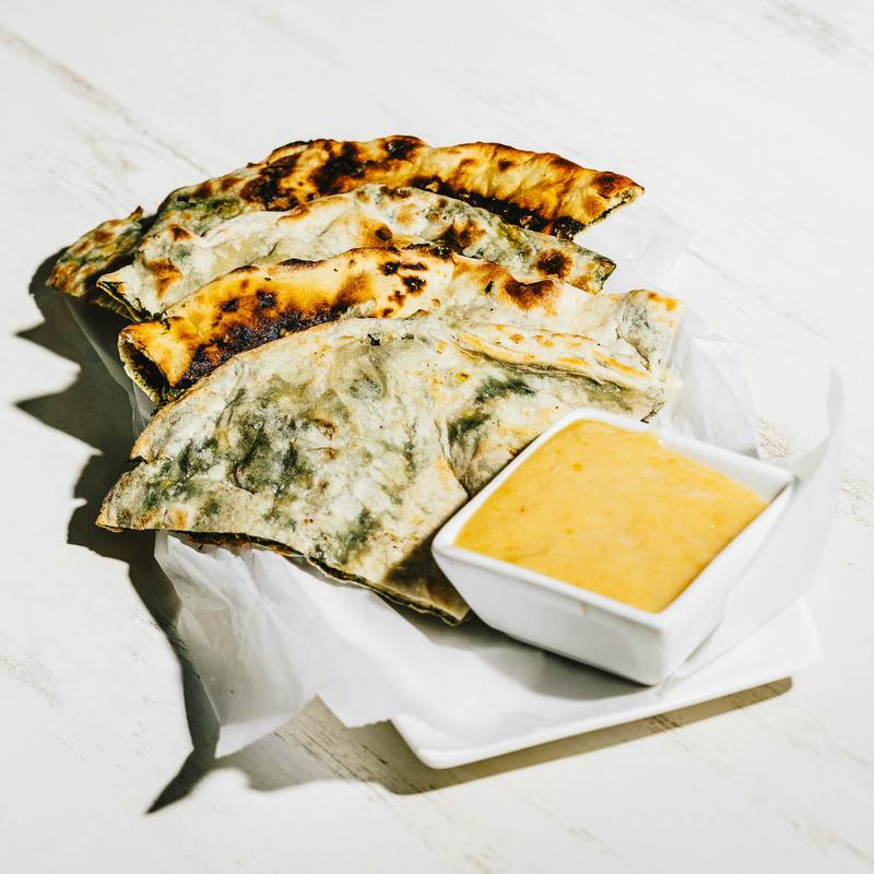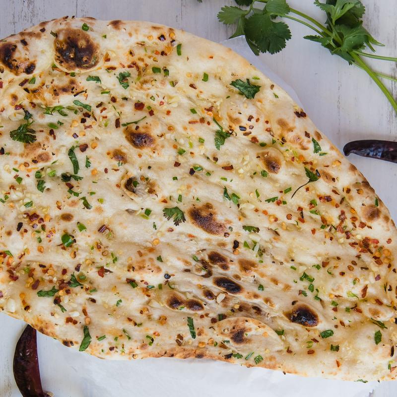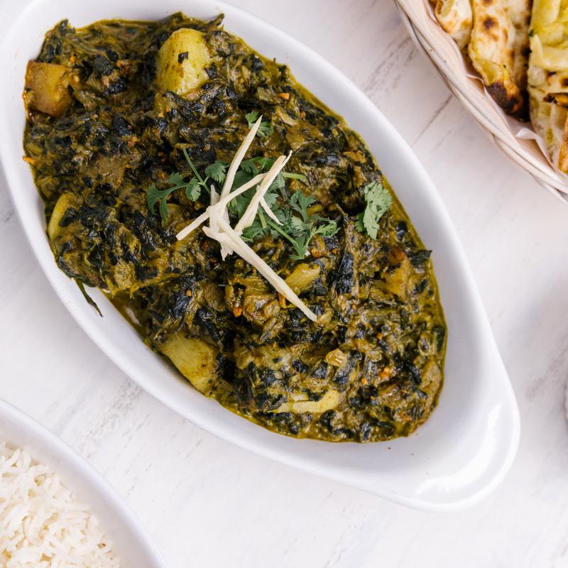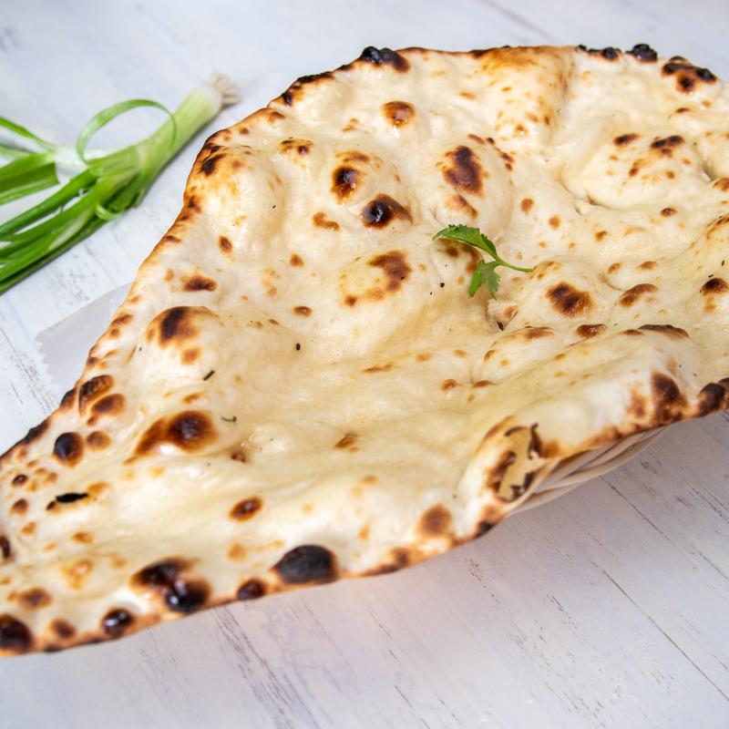 Soft, fluffy naan bread topped with a flavorful blend of spinach and mustard greens, cooked with aromatic spices. It is a perfect accompaniment to any meal, offering a delicious and nutritious twist on traditional naan. NF.