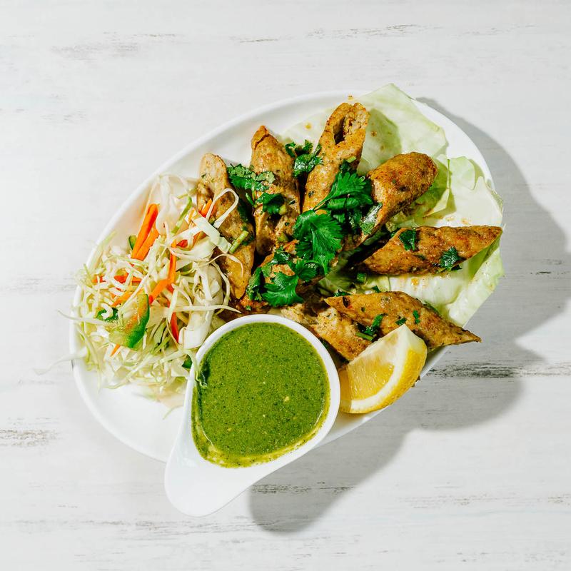 Juicy minced chicken mixed with aromatic spices, herbs, and a hint of lemon juice, shaped onto skewers and cooked in a clay oven to perfection. These kababs are tender on the inside with a slight char on the outside, offering a burst of flavor in every bite.. DF, GF, NF.
