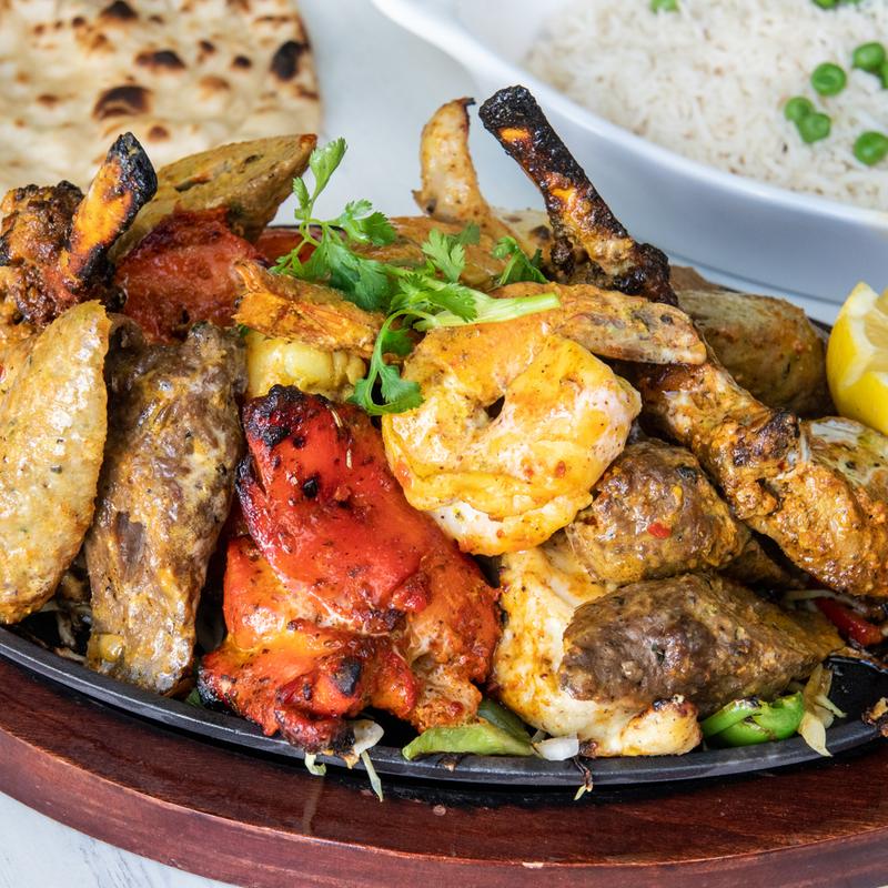A sumptuous platter featuring Lamb Chops, Chicken Tikka, Chicken Seekh Kabob, Chicken Malai Kabob, and Tandoori Prawns, all cooked to perfection in a clay oven. This dish is served on a bed of tandoori vegetables, offering a variety of flavors and textures in every bite. GF, NF.