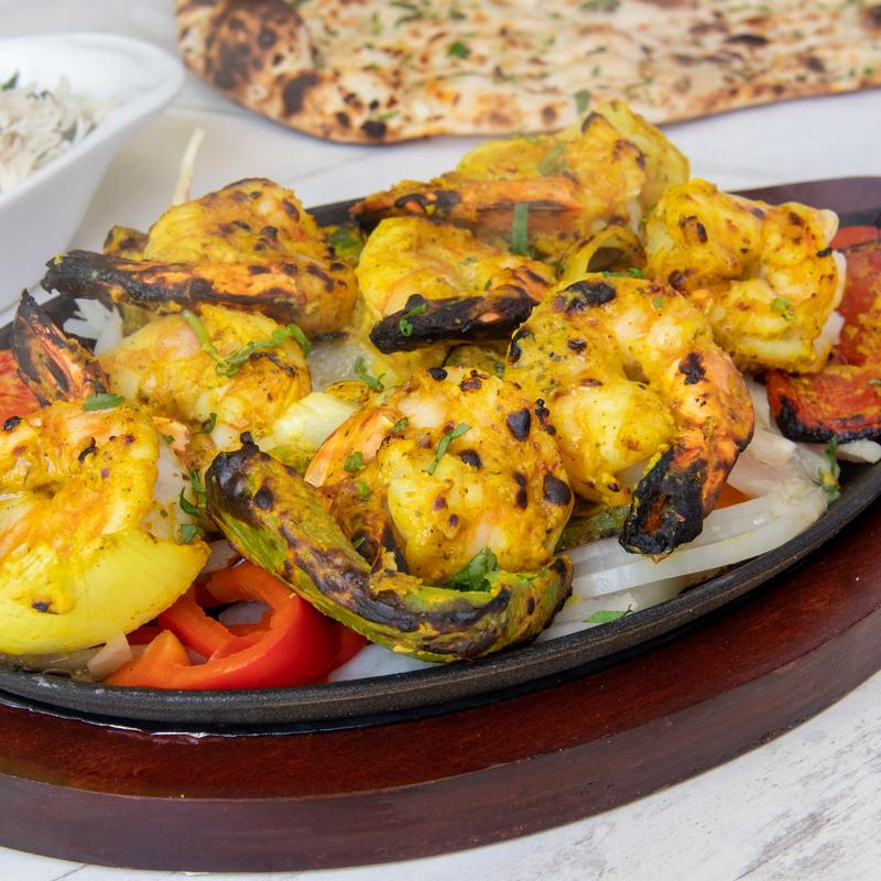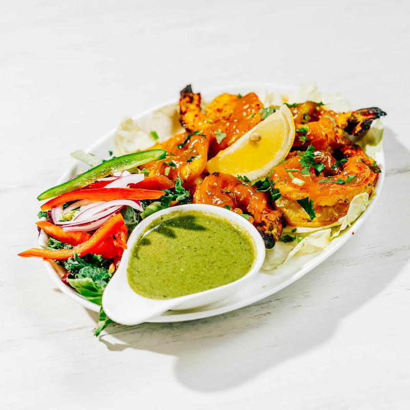 Succulent tiger prawns marinated in a blend of yogurt, lemon juice, and traditional Indian spices, then cooked in a clay oven. This dish is served on a bed of tandoori vegetables, offering a smoky, charred flavor with a juicy and tender texture, making it a delightful and flavorful option. GF, NF.