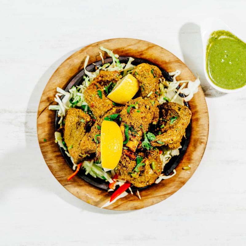 Tender artichoke hearts marinated in a blend of ginger, garlic and aromatic spices, baked in clay oven (6 pcs). DF, GF, NF, V.