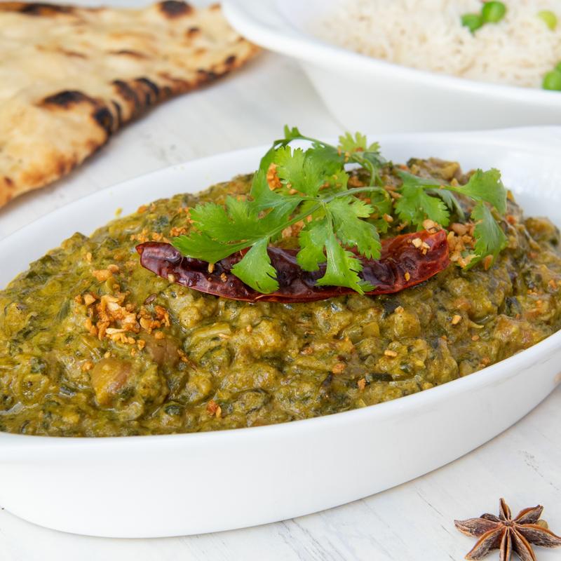 Lentils and spinach cooked with onion, ginger, garlic and cumin.